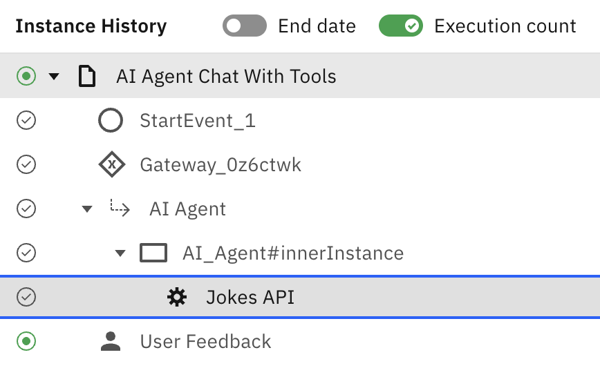 - In the execution tree, select the AI_Agent#innerInstance parent element of the Jokes API tool. You will see: