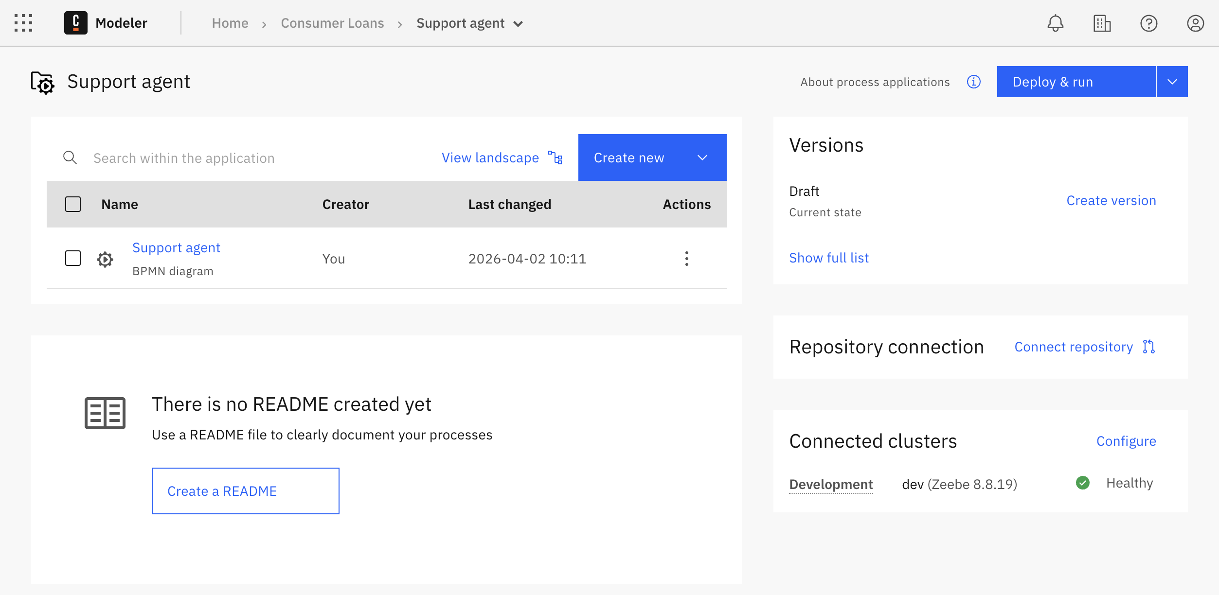 After creating the process application, you land on the process application homepage. From there, you can manage and explore files, preview the README if it exists, create and manage versions, set up and sync with a Git repository, connect clusters to the process application, and deploy or run the process application.