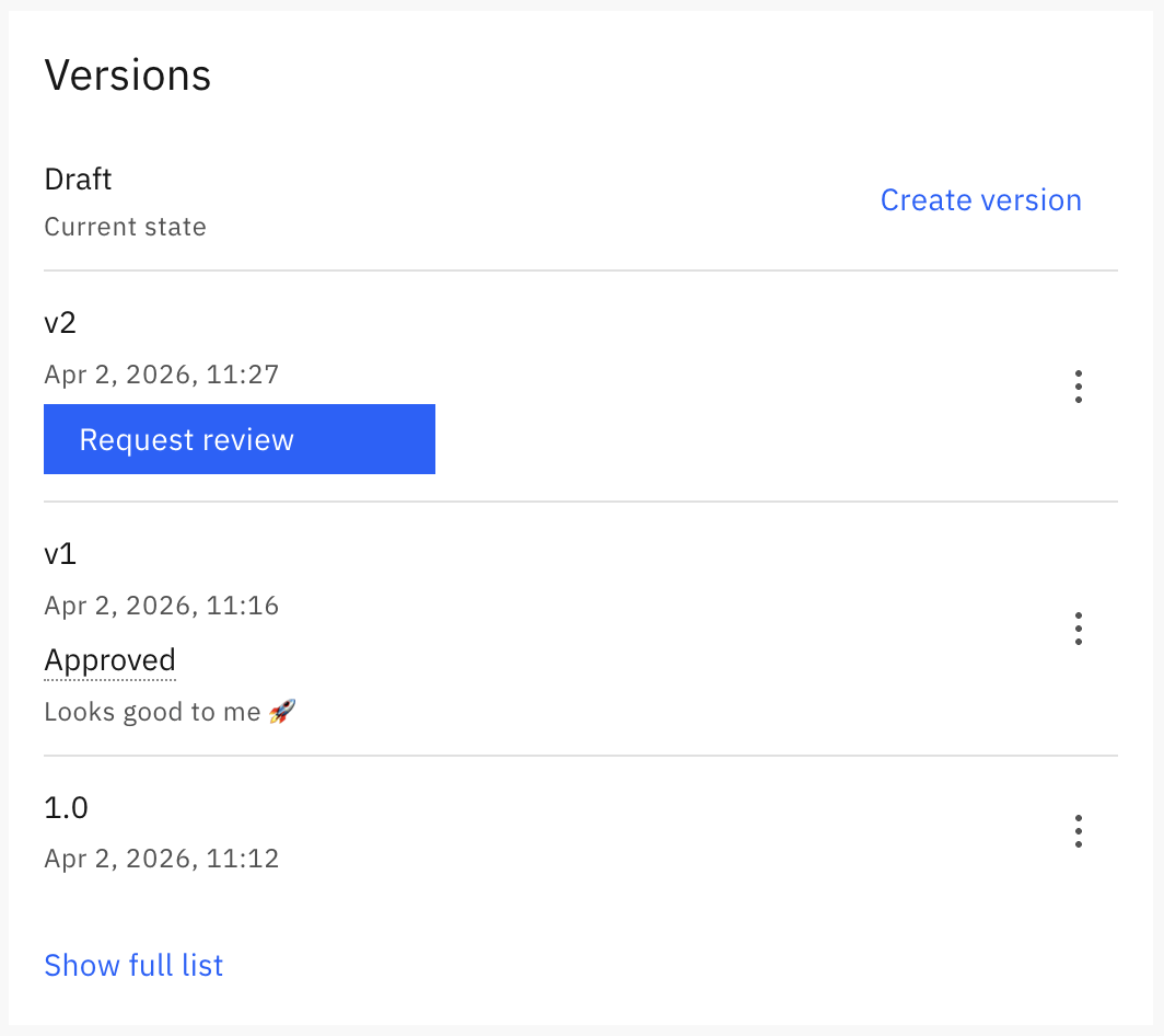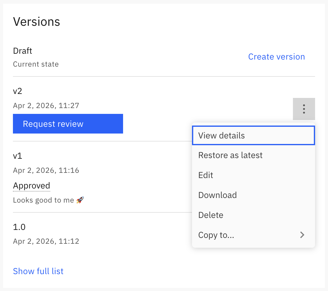 - View details, which opens the version details page so you can review the contents of all files in the version.